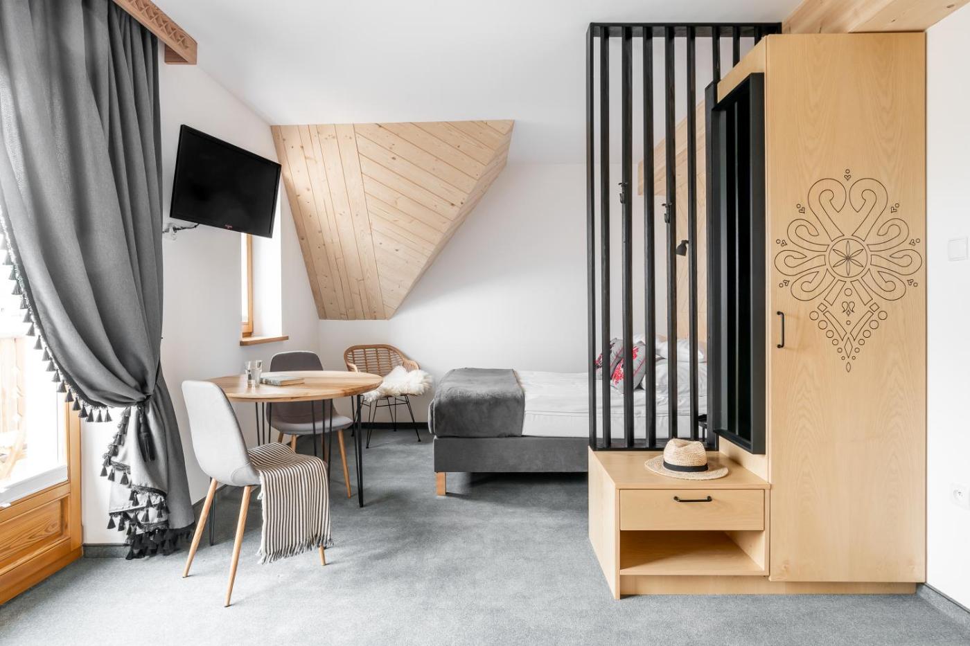Apartament typu Deluxe Suite. This suite features 1 living room, 1 separate bedroom and 1 bathroom with a walk-in shower and a bidet. Meals can be prepared in the kitchenette, which has a stovetop, a refrigerator, a dishwasher and kitchenware. The suite has a wardrobe, an electric kettle, a sofa as well as a balcony with mountain views. The unit has 2 beds. Apartament typu Suite - 2 osobowy. Powierzchnia pokoju ok.: 33 mkw. ;